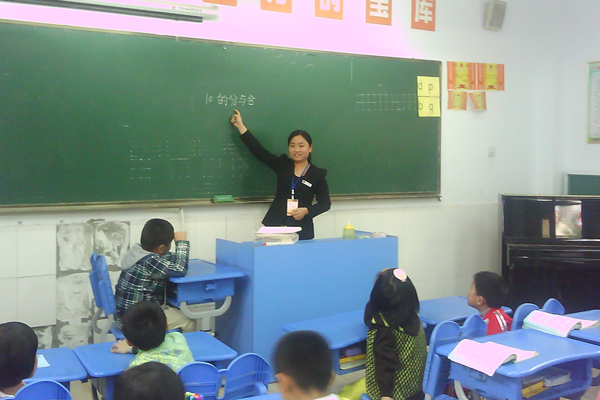 10月16日下午,小一艺术班教室里济济一堂,胡婉群老师正在上教研课《10的分与合》,其他各年级组的数学老师同聚在一起研讨。