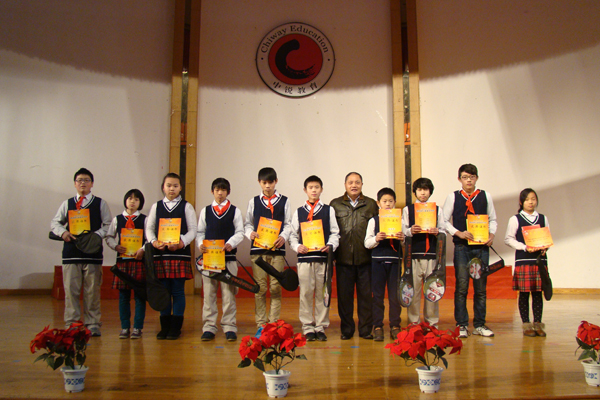 元旦汇演结束后,是本年度受到表彰学生的颁奖典礼,世界外国语学校的邵忠德校长和何全胜副校长亲自为学生颁发奖状并合影留念。一份耕耘,一份收获,在为这些勤奋好学的孩子们感到高兴的同时,也期待着来年的世外更加精彩无限。