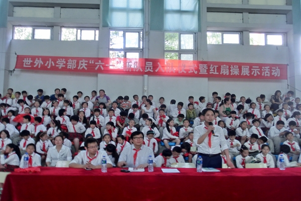 星星火炬,代代相传,红旗一角,鲜艳荣光。伴随着《少先先锋队队歌》,合肥世界外国语学校2014年秋春季新队员入队仪式正式开始了。戴上鲜艳的红领巾,156名学生快乐地成为了光荣的少先队员。新队员们在少先队队旗下庄严宣誓,时刻准备着为共产主义事业贡献一切力量。小学部方仁武主任在这个快乐的节日里对学部全体学生送去了美好的祝福,同时,也提出了殷切的期望,希望学子们快乐学习,全面发展,做一名合格的小学生。入队仪式结束后,是学部各个班级的红扇操展示活动。学生们个个精神抖擞,动作规范、标准。充分展现了世外小学部学生的精神面貌,展示了学生的风采。