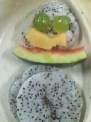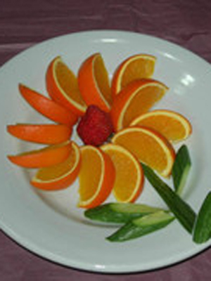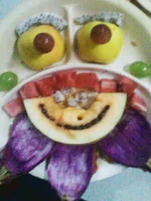 苹果、香蕉、火龙果、芒果等水果散发着阵阵清香,圆形、方形、三角形,绿色、黄色、红色、橙色的水果出现在同学们的面前。瞧,大家四人一组,开始做水果拼盘了,同学们各自分组分工,有的同学削皮,有的同学插牙签,还有的同学摆造型,忙的不亦乐乎。很快,在规定的时间里,内容丰富、五彩缤纷的水果拼盘造型映入眼帘:把西瓜切成小船,把黄瓜切成花瓣,上面点缀红通通的小西红柿,橙子成花朵;活泼可爱的小朋友、栩栩如生的小鸟、民族团结故事、引人入胜的风景画……