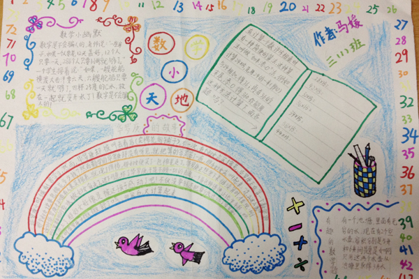 为了激发学生学习数学的兴趣,促进学生广泛阅读数学报等课外数学书籍及报刊杂志,开阔视野,丰富百科知识,培养学生排版、配图等美术素养,小学部数学组在三四年级开展了数学手抄报评比活动。