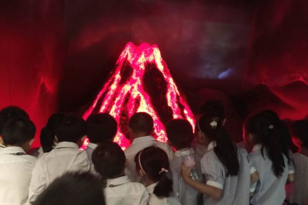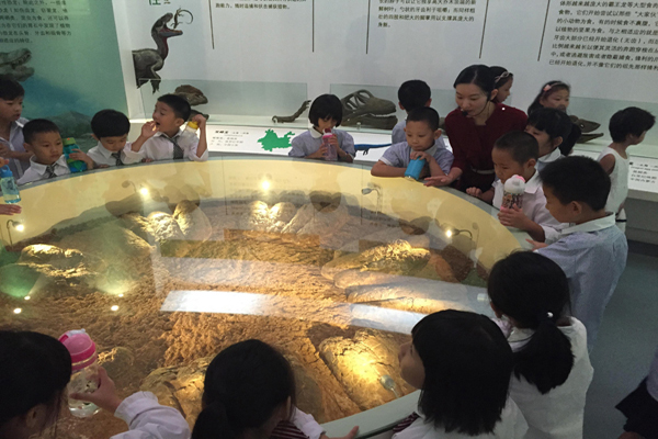紧接着同学们又来到了合肥地质博物馆,走进地质博物馆,迎接我们的是两只巨大的马门溪龙。这两只马门溪龙全身深褐色,脖子很大很长。其中一只把头伸到树上,美美地咀嚼着树叶;另一只把头抬得高高的,警惕地注视着前方,好像在为同伴放哨,又像是在寻找着久别的老友,孩子们很快就被吸引住了。进入馆内后,跟着美丽的解说员,孩子们似乎对我们生活得星球有了新的了解。