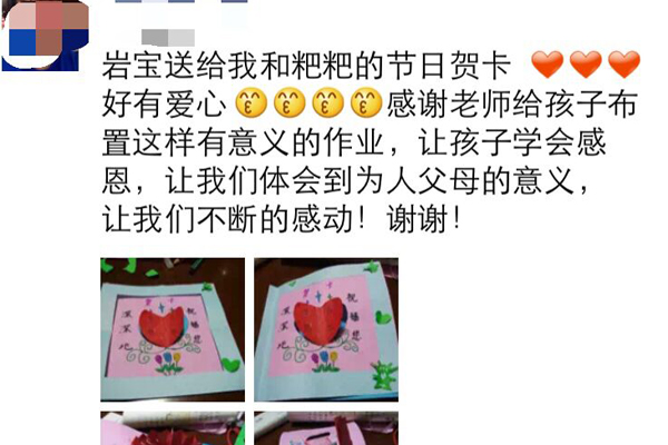 放假前,我就跟孩子们约定好了回家要给父母做贺卡并让父母通过微信发给我的任务。放假第二天就有家长开始在群里晒孩子的贺卡了,这让我着实很感动也很感谢。这几天,我班的微信群里也异常的热闹,大家你一句我一句的,都在讨论着贺卡的制作,有的家长担心贺卡做的不好,就让孩子自己先做了一张,再跟着孩子一起重新做了第二张;还有家长直接将孩子制作贺卡的过程拍了视频发给我。都说家长是孩子的榜样,有这样的好榜样在,我们还担心什么呢?