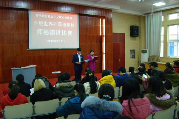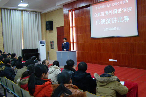 2月1日下午,我校在阶梯教室开展了以“社会主义核心价值观”为主题的师德演讲比赛,来自幼儿园、小学部、初中部及高中部的14位参赛教师将真实的典型事迹与鲜明深刻的师德理念结合起来,从不同角度、不同层面共同表达了热爱教育事业、热爱学生,与学生进行情感交流,构建和谐师生关系;参赛老师们在台上讲述自己的故事,述说着对教育事业不懈的追求,台下的老师们认真地倾听着,一篇篇激情洋溢的演说,一句句饱含深情的话语,一个个生动的实例,反映了作为一名教师的平凡,折射出世外教师心系学生,爱岗敬业,甘于平凡,默默奉献的不平凡,高尚的品德、无私的奉献、伟大的精神此刻在这里得到了升华。