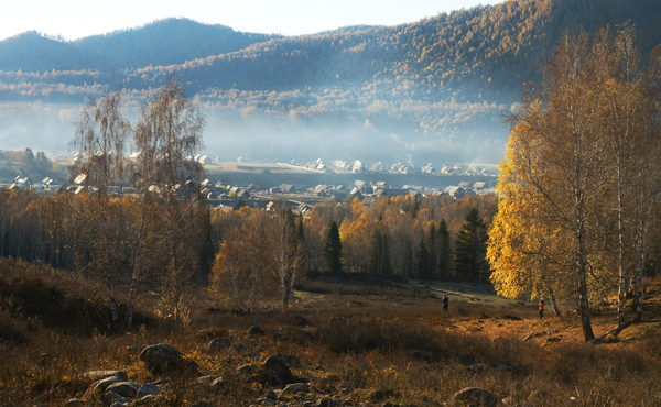 每当金秋来临时,喀纳斯地区的森林便形成了一片“金色海洋”,当阵阵微风拂来,仿佛是成千上万片树叶开起了音乐会,时而优美恬静时而激昂雄壮。十月之初的金秋时节,是喀纳斯最美的时候,也正是因为对这优美景色的向往,我和爸爸随着“徽州驼帮”一起来到了这美丽的地方。