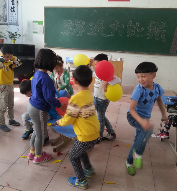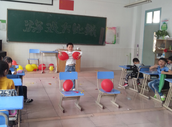 小一艺术班的教室里,孩子们的笑声,闹声响成一片。这里,正在举行一场别开生面的“屁股坐气球”比赛。淘气包刘宇航坐上气球忍不住手脚并用;胆子最小的苏煜轩一边捂着耳朵,一边重重地向下挤压气球;小个子欧家安毫不气馁地一次又一次从地上捡起气球,誓与对手比高下。一个、两个、三个……孩子们秩序井然。旁边由班长带头组成的拉拉队,拼命呐喊,为每个同学鼓劲。