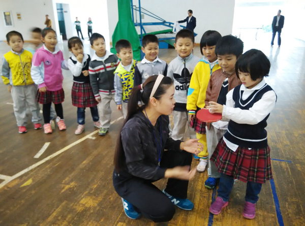 趁着孩子们兴奋的劲头,我们进行了最后一项学生个人活动“端球接力”——将乒乓球放在乒乓球拍上端到终点,哪组用时最短哪组就赢,这可有点难了,小小的乒乓球想要控制好它并不容易,有的孩子刚放上去球就滚下来了,有的孩子走几步球就掉下来了,更别提跑了,就算这样,没有一个孩子放弃比赛的,一个一个冲过了终点,家长们对这些孩子们“坚持到底”的精神称赞不绝。
