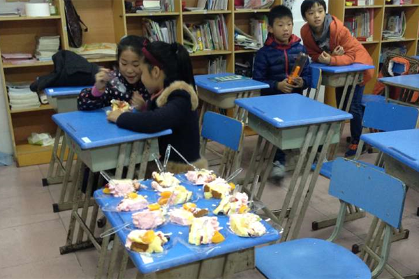 不知是谁起的头,班里开始了一场“奶油大战”,不一会儿,很多同学都被涂的满脸都是,看,同学们脸上都像只大花猫一样,又好笑又滑稽。