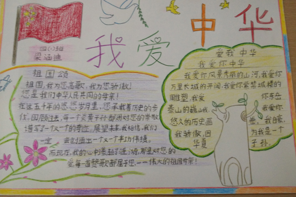每个班的手抄报主题都别具匠心。有的以“爱我中华”的主题展开,希望通过这次活动让学生更加热爱自己的祖国,珍惜今天来之不易的幸福生活;有的以“感恩父母”的形式,让学生体会和感悟父母之爱,懂得并学会感恩回报;有的以“中国传统节日”为题,让学生了解中国传统的节日以及在节日里的风俗习惯,让学生感受中国文化的博大精深;还有的甚至想充分发挥学生丰富的想象力以“未来世界”为主题打开学生对未来的无穷想象和追求。