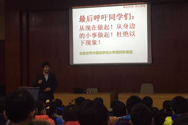 2015年12月13日是南京大屠杀77周年纪念日,也是南京大屠杀死难者国家公祭日。为纪念这一特殊的日子,为了让孩子们不忘历史,祭奠在这场浩劫中遇难的中国同胞,教育和鼓舞学生勿忘国耻、缅怀先烈,激发学生的爱国情感和民族责任心,小学部四年级全体师生于当天晚上秩序井然的齐聚在学校大礼堂开展了“铭记历史,不忘国耻”的主体班会活动。