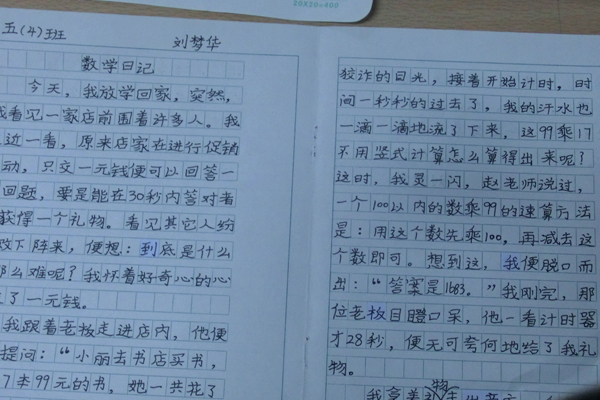 众所周知,数学与生活有着密切的关系。然而,在大多数孩子心中,数学就是与数字打交道,学会加减乘除就万事大吉了,甚至有些同学数学成绩很好,但却不会用所学知识解决生活小问题,甚至根本没想到把所学运用到生活中。为此,数学组根据学生的学情现状,制定了本学期的学生活动,决定在五年级组开展学生数学日记活动,以此来激发学生们去发现数学知识与生活有着密不可分的关系。