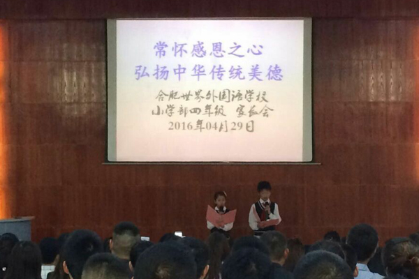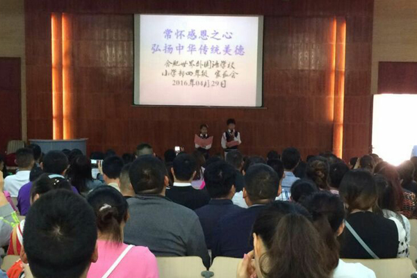 学生拥有一颗感恩的心,才懂得去孝敬父母;拥有一颗感恩的心,才懂得去关心、帮助他人;拥有一颗感恩的心,才会勤奋学习,珍爱自己;拥有一颗感恩的心,才能学会包容,赢得真爱,赢得友谊;拥有一颗感恩的心,才会拥有快乐,拥有幸福,才会明白事理、更快的成长,就能够拥有一个美好的未来。针对当今社会上和我校一些学生中存在的不被感动、不知感恩,任性、冷漠、自私的心理和行为,我校小学部四年级组于4月29日上午特开展以“心存感恩,成就人生”为主题的家长会。