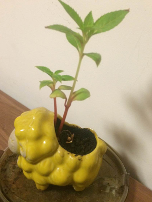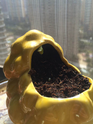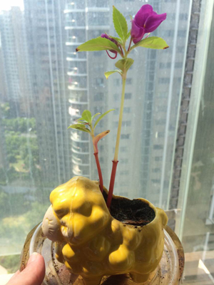一到家,我就找来一个小羊花盆,把凤仙花种了进去,还浇了适量的水,那天阳光很好,我就把它放在阳台上晒太阳,希望它长得更快、更好。