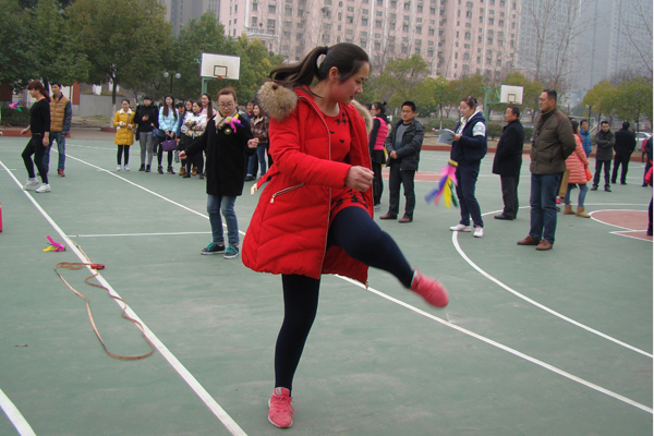 比赛在欢快有节奏的气氛中进行,现场热闹非凡,教职工们全力以赴、你争我赶的同时不时引得观众的加油喝彩,平时给人印象睿智、成熟、知性的女教师们,在比赛中都表现出了活力四射的另一面。邵忠德校长带领校长班子也积极观战。在1分钟跳绳比赛中,只见各位老师的绳子上下飞舞、全神贯注;在单人踢毽子比赛中,只见脚上的毽子一跃而起,她们争分夺秒、身轻如燕,跳动的毽子犹如个个音符,交织成了一曲曲优美动听的交响……在集体跳长绳比赛中,初中部发扬团队协作精神取得了团体第一名;在抛砖引玉比赛中,小学部在总结经验基础上,发扬奋力拼搏精、以稳健快速的步伐而赢得团体冠军。