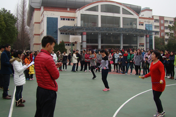 运动会于8日下午两点半在校体育馆举行,全校的女教职工都积极参与比赛,选手以部门为单位组队参赛,共设幼儿园、小学、初中、高中、后勤和行政六个队。比赛项目有单人项目和团体项目,有“1分钟跳绳、单人踢毽子;集体跳长绳、抛砖引玉”。