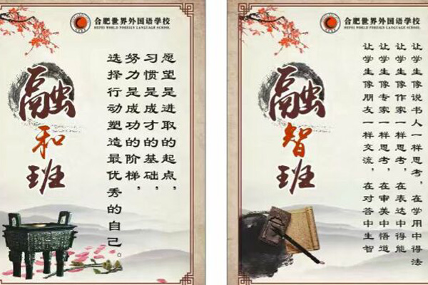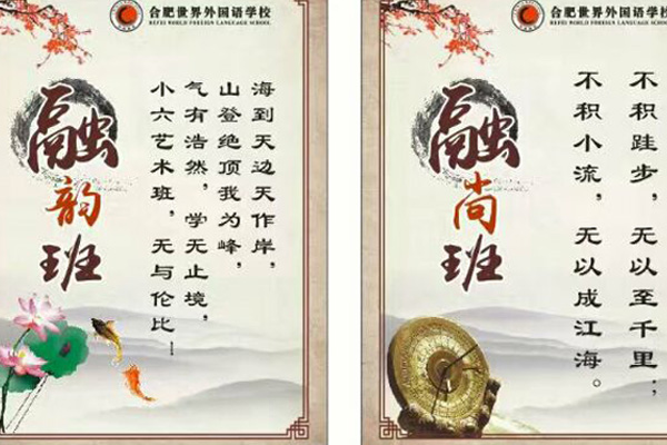 “融”字立在世外校园最醒目的位置,他似乎在无声地告诉每个走进世外的人,我校的融之理念,融之文化。作为世外的师者,除了本身必须具备为师者的专业技能外,还要有对学校教育理念的情怀,这种情怀不仅仅要体现在你个人的言行举止上,还要让你的学生感受得到。在这种校园文化的感染下,一个构思在小学部六年组开始酝酿,开学就是六年级了,在这小学生活的最后一年里,我们要给孩子们留下什么?年级组长刘培蕾结合校文化底蕴,制定了以“融”文化为主题的年级组文化建设。为了在开学当日把文化长廊布置完成,六年级组的老师们开始了与时间赛跑,培蕾组长带着班主任开始了班名的讨论,结合班情与班风,融和,融智,融耀,融尚,融乐,融韵班相继出炉,班名下方衬上班主任的寄语,润生无语,我们把这份浓浓的师爱嵌在字句当中。每班长廊的首端,老师们统一选定了以《劝学》为主的警语或诗篇。劝学――师对生最柔情的教诲;劝学――师对生最深的期盼。劝学语落在中国风的水墨山水画中,显得如此宁静致远。从一班到六班,还有几十首老师们精心选取的古诗。诗篇立在扇形的橱窗里,每首诗都有一个故事,像是在期待孩子们走进诗的国度,领悟中国古诗的魅力。