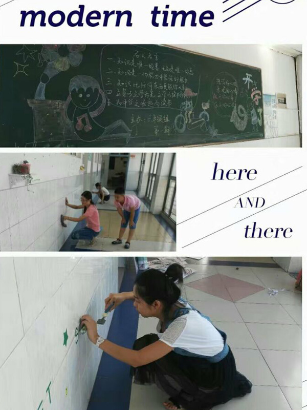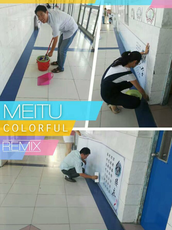 清晰的记得开学初前几日,每个夕阳落日下,都能看到六年级的老师们还在班级门前打扫,班名要牢牢固定在班级门口的墙壁上,劝学文要顺利上墙,古诗要工整地立在长廊里。汗水滴在教室的磁砖上,风过,毫无痕迹。但我们知道,这种情怀会落在我们的教育生涯里,它会生根,发芽,长大。现在,每个课间,总会看到三三两两的同学从长廊这端慢慢移步那端。读读诗,说说诗中的故事。铃声响起,再说说笑笑地散开,这一幕,真是成了文化长廊里每美的一景。布置文化长廊,初衷并不是为了班级的美化,而是想让学生们感受文化的魅力与精髓。我想,老师们最初的目的是达到了。