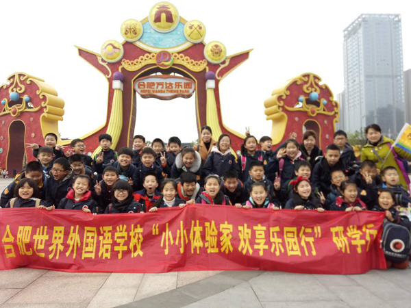 一大早,我们来到教室,董老师对我们进行了安全教育后,便乘大巴车出发了。在车上,导游姐姐向我们介绍了万达主题乐园是室外大型徽文化主题乐园,园中的设计都有徽风徽韵,拥有徽州古韵、梨园春秋、欢乐水乡、巢州古城、梦蝶仙境、淝水之战六大主题区域。导游还向我们介绍了乐园里除了很多好玩的游乐设施,还有精彩的演出。听了导游的介绍,我们更期待了。