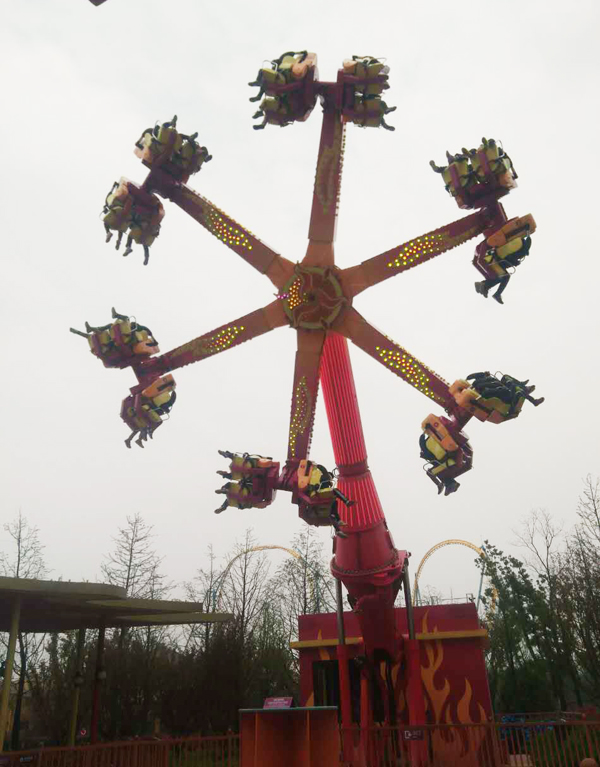 从梦蝶剧场出来,我们一起玩了“果虫滑车”、“彩蝶飞舞、”“空中骑兵”、“风火飞轮”“旋转木马”……我觉得“风火飞轮”最刺激。它像一个大型车轮,有12个座位。我和同学们坐上以后,飞轮慢慢上升,由横着转动到斜着转动,再到竖起来像车轮一样滚动,我们悬在空中,被360度旋转,“啊——”同学们一阵尖叫,太震撼了!随着车轮减速,我们下来了,你看,大家发型已乱,几个女同学互相搀扶,腿已发软;新生江丰毅已泪流满面,瘫坐在地下继续哭;我们几个胆大的男生喊着:“再来一次!再来一次!可不可以!可不可以!”董老师说:“你们还敢啊?”“是!”大家齐声喊。我们一看这时间人少,也没有别人排队,看老师没有反对,我们几个勇士又体验了一次。