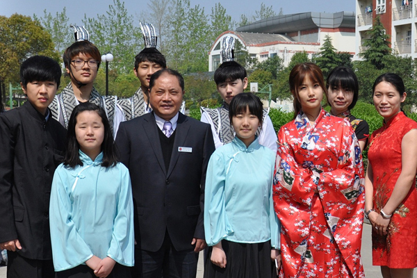 国际部师生身着特色服装和邵校长合影