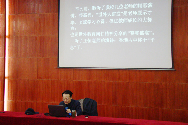 张发东主任自加盟世外以来,以他丰富的教育教学经验,专业的教学指导为我校的教育教学工作增添了几抹亮色。很多年轻的老师在张主任的细心指导下,教学能力得到了显著提高。今日的大讲堂上,老师们又再次领略到张主任深厚的文化功底,与其说老师们在聆听讲座,不如说那是一种发自内心的学习欲望。