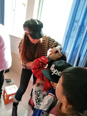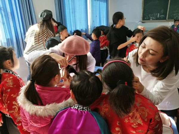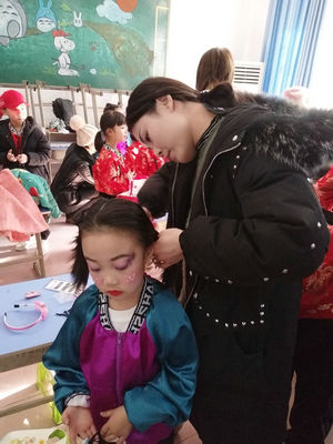当然一年级小朋友们家长的热情也是非常高的,你看各位家长们正在积极的帮着小朋友们做表演前最后的准备。各位家长有条不紊的分工合作,梳头的、换衣服的、化妆的……经过各位家长的巧手每一位参加表演的小朋友们都一个个变成了坠入凡间的“小精灵”。