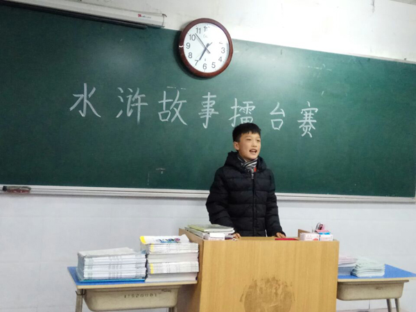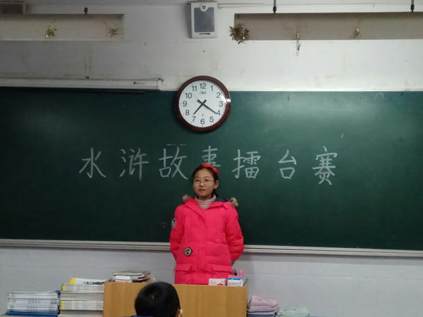经过两周的前期阅读,1月11日晚,五年级各班利用晚自习分班开展“水浒故事擂台赛”。活动在《好汉歌》中拉开序幕,同学们热情高涨。参赛选手在课后都做了充分的准备,所以个个精神饱满。他们有的幽默风趣、妙语连珠,有的声情并茂、神采飞扬。现场气氛热烈,掌声不断。在一个个精彩的故事中,我们仿佛看到了武松打虎时的勇猛机警,林冲雪夜上梁山的无可奈何,吴用智取生辰纲的智谋双全,宋江救人大难的侠肝义胆,柴进对待朋友的仗义疏财……在同学们一个个娓娓动听的故事中,我们看到梁山好汉他们虽然性格各异,却同样的坚毅不屈,体现了中华民族那铮铮铁骨的豪气干云。