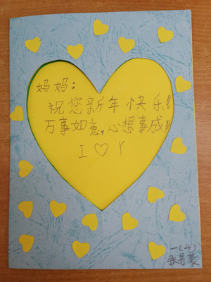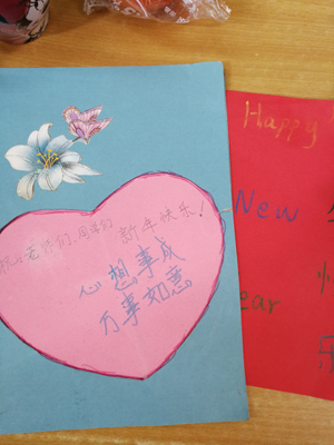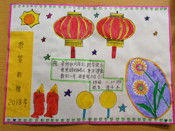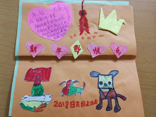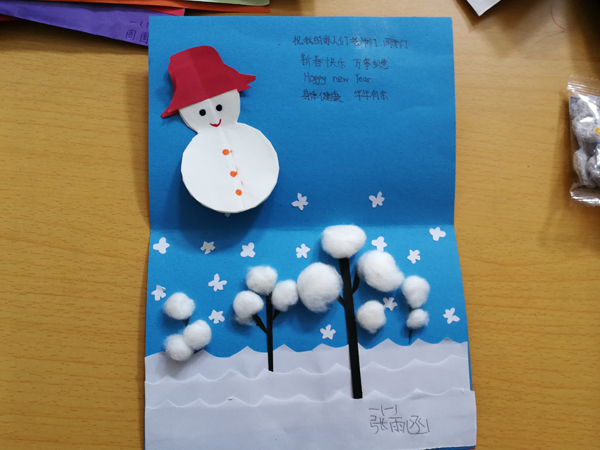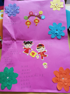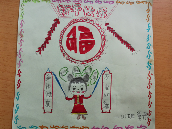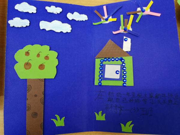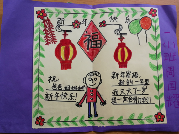 在微寒假作业中,一年级的小朋友充分发挥自己的想象力,设计出一张张精美的贺卡,用彩色卡纸剪出一幅幅独特的图片,并写上一两句对亲人、老师美好的祝福或感恩词,真是“年味浓浓,情意满满”!