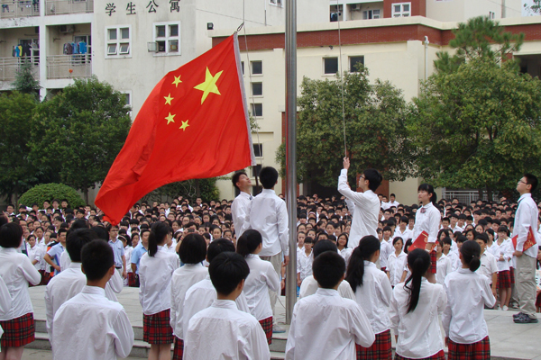 在全体师生的注目礼中,升旗仪式正式开始。迎着秋风,由九(5)班组成的国旗护卫队迈着铿锵的步伐,英姿飒爽地来到了国旗台下。伴随着庄严的《义勇军进行曲》中,升旗手振臂一挥,鲜艳的五星红旗徐徐展开,迎风飘扬在世外的高空。全场一片肃静,在场的每一位老师和学生向国旗行注目礼,深怀对祖国无限的热爱和崇高的敬意。