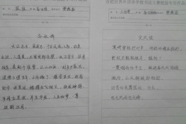 为弘扬中华民族传统书法文化,丰富校园文化生活,营造学书氛围,进一步提高学生的汉字书写能力。5月19日合肥世界外国语学校高中部举行了学生书法大赛。