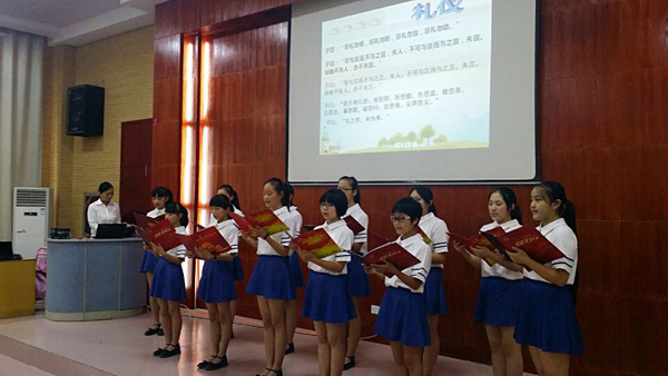 子曰:“礼之用,和为贵。”子曰:“人而不仁,如礼何?人而不仁,如乐何?”子曰:“非礼勿视,非礼勿听,非礼勿言,非礼勿动。”……随着八年级女子菁英班的齐声朗诵,我们走入了文明礼仪大讲堂。