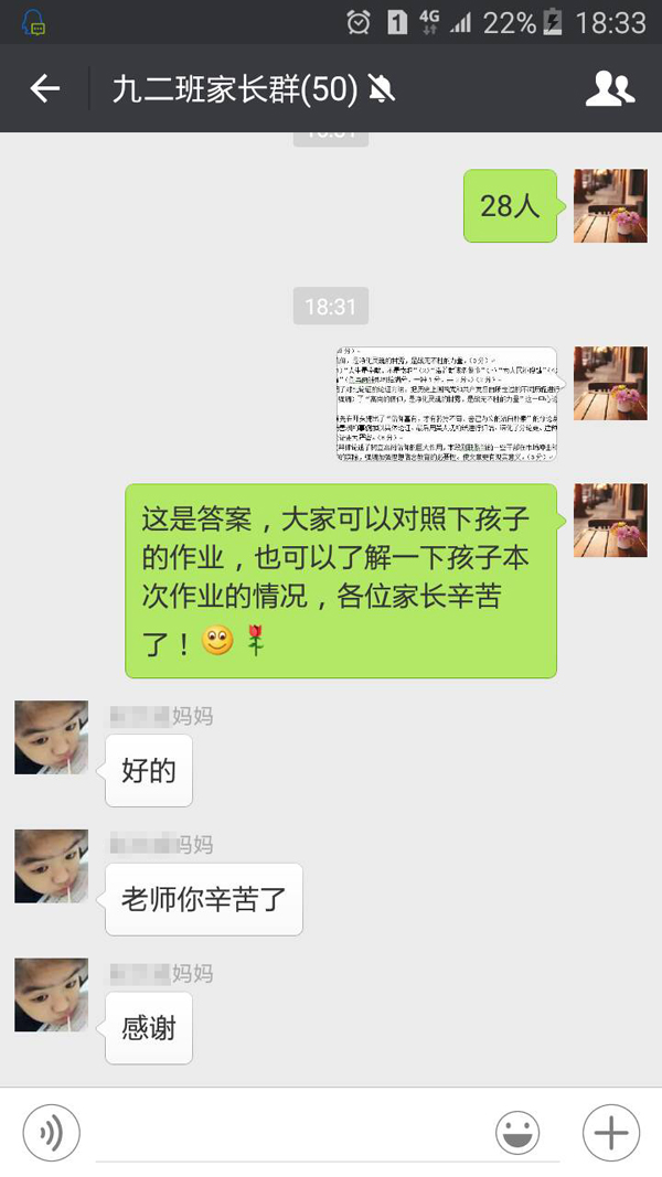 尽管这样,世外初中部的老师们依然心系学生,为此,各班建立了家长微信群,制定了假期电子作业,每天布置两科高质量的作业,通过微信传送给家长,孩子做完以后,家长再以照片的形式回传给各任课老师,各科老师根据孩子作业情况一一解答,待作业收齐后再将答案在微信群里发布,以便于孩子订正,这样以来孩子既不觉得作业多,也能够认真对待,收到很好的教育教学效果。