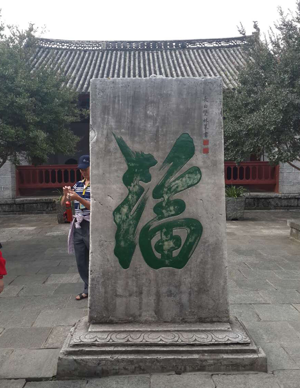 双脚踏在一块块青石板上,其表面沧桑的纹路仿佛在向我们讲述着一段段辉煌的历史。带领着我们的是一位美丽的“金花”,她以她丰富的知识使我们徜徉在大理国的灿烂文化中。首先她带领我们参观了标志性的碑文,那一行行至今仍清晰的文字,字里行间无时无刻不在向我们透露出了纳西族人民的勤劳与智慧,让游人们赞叹不绝。最让人印象深刻的就是那“福”字碑了。
