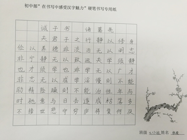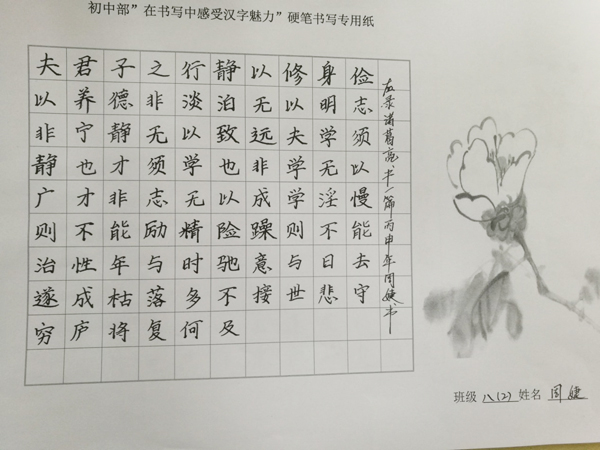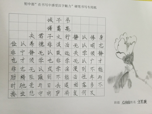 为了传承我国悠久的文化精髓,加深同学们对我国书法艺术的了解,让广大书法兴趣爱好者互相交流、学习、进步,合肥世界外国语学校初中部在张小平校长助理的关怀下,在初连玉副主任的指挥下,智慧筹划了初中部硬笔书法大赛。