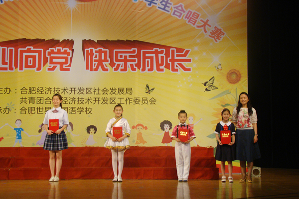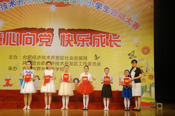 经开区2015年度“童心向党 快乐成长”中小学生合唱比赛由经开区技术开发区社会发展局、共青团合肥经开区工作委员会主办,合肥世界外国语学校承办。共有区内17所中小学学校参与比赛,其中小学组13支代表队,中学组5支代表队。比赛采用打分制,特别邀请三位资深专业音乐老师担任评委,合肥市文明办领导、经开区管委会相关领导也莅临现场观看合唱比赛。