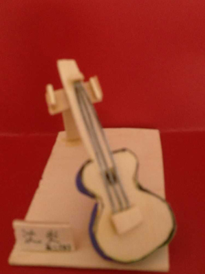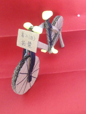 有些作品也许可能谈不上设计高度和创新制作,但是每一件作品都有其亮点。如二三的谭霞同学的环保烛台,制作上颇费功夫,能够活动转动的两扇门的制作是这次作品中难得的亮点。二四班的张洁、日班黄匀岭同学制作的看似简单的牙签小凳子,用36根细杆并排作的凳面8根横梁加固,既有强度又有稳度,把结构的强度与稳定理论用在了实处。还有二四班沈炎同学的吉它,小巧精致。还有缪莹莹同学的花蓝,颜色搭配漂亮。还二四班拓慧同学的自行车,结构巧妙。徐陈程同学制作的豪华椅子,造型优美,还有几个纸飞机纸火箭坦克模型,设计不错,当然纸的强度也不够,还没有开始飞上天就受伤,零部件损坏了……。