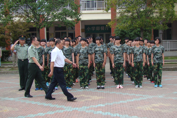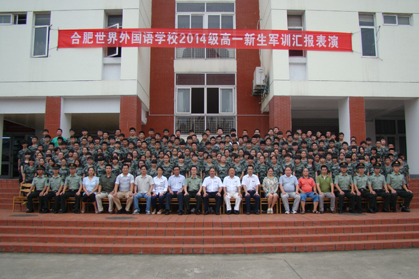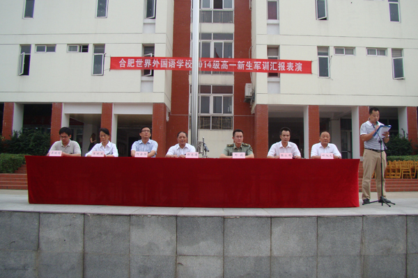 8月30日下午三点,在学校礼仪广场,隆重举行2014级世界外国语学校高一新生军训汇报表演,出席汇演的领导有陆军军官学院训练基地政治处主任邱剑少校,世外党支部书记校长邵忠德、副校长何全胜、党支部副书记叶旭光、校长助理张永国等,汇报表演由陈海波副主任主持。