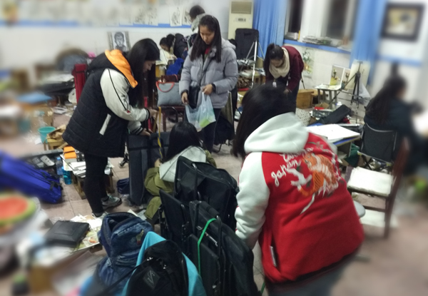 考试前一天晚上,同学们上完专业课后,收拾画具,为第二天考试做好了准备