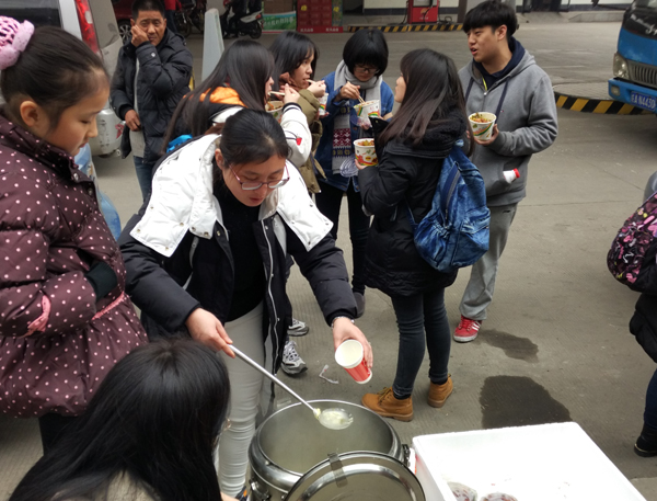 午饭虽然简单,但是饭菜都是热腾腾的。班主任李宁老师正为学生打汤。