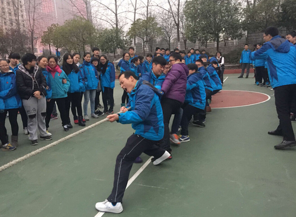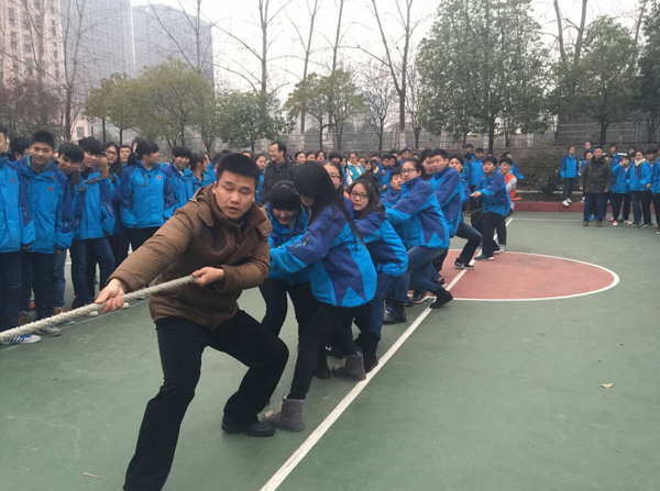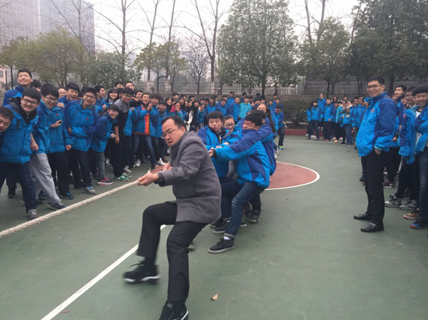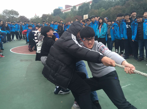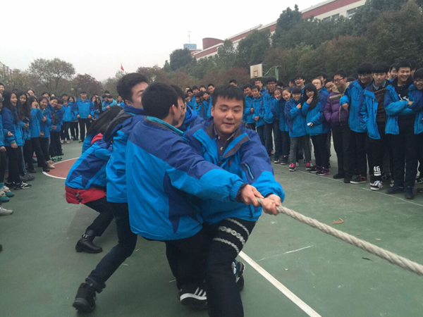 同学们走到操场,只见一条又粗又长的“大蟒蛇”,横跨在篮球场中央,它的中间还系着一根红布条。当时,在场的同学非常多,比赛还没有开始,全场就响起了此起彼伏的加油声。各个班级抽完签,分好小组,大家就开始练习拔河的姿势。首先是高二日语班对阵高二(1)班,参加的同学们都很紧张,尤其是高二日语班的学生,他们面对着强敌,毫不懈怠,不过有班主任的加盟,让他们心安了不少,都围在一起商讨对策。听着体育老师的发令声,同学们屏气凝神,半蹲着身体,往后倾斜,都拼命的向后使劲,可惜实力悬殊较大,高二日语班还是输给了高二(1)班。