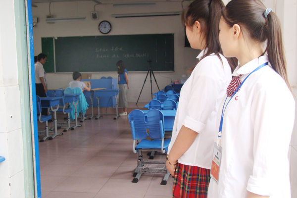 王香君在两名学生志愿者及主考邵忠德校长副主考王宏锦校长的陪同下走进考区