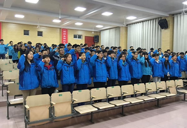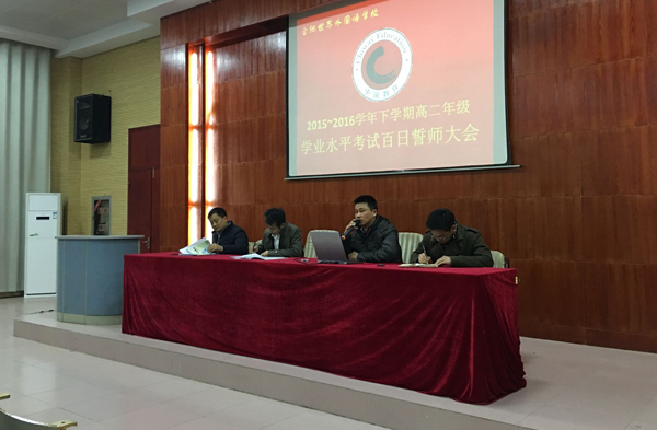 在这春暖花开的时节里,作为高考重要组成部分的高二年级学业水平测试,估且称之为小高考,已悄悄地向我们走来,距离“小高考”仅剩下100天了。2016年3月14日晚六点半在阶梯教室,高二年级举办了学业水平测试的誓师大会。会议由高二年级组长何永松老师主持,主席台上就坐的领导有张永国校长助理、吴琪琦主任、陈海波副主任。何组长在会上指出学业水平测试的重要性,鼓励学生抓住时间,坚定信念,努力奋斗,勇往直前。