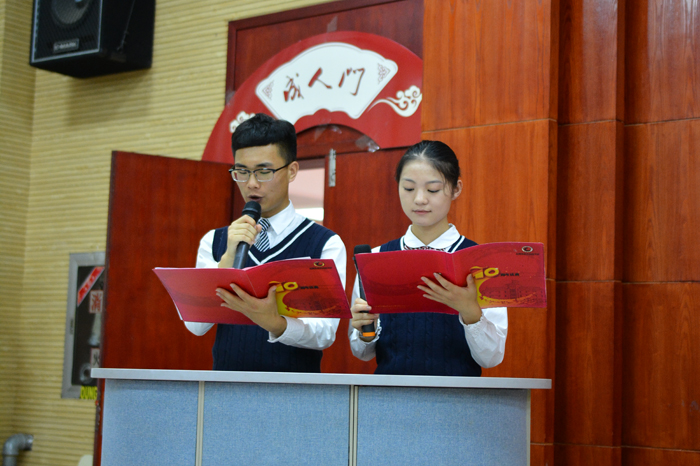 接下来 ,袁海若、陈宇辉两位主持人代表全校学弟学妹们为成人的同学们送上一首诗歌朗诵《今天,我们十八岁》做为祝福。两位主持人精神饱满、声音洪亮,抑扬顿挫、感情充沛,诗歌文采飞扬,赢得了交口称赞。