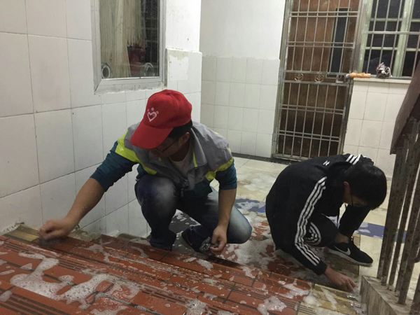 友爱,就是将爱与热情传达给每一个人。在清洗楼道的时候,志愿者们积极向上,将自己的热情留在了阶梯上。