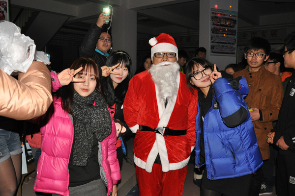 之后是韩国学生的吉他演奏——《Merry Christmas》,欢乐动感的歌声祝福在场所有的中外师生们节日愉快!歌声刚落,背着大大的礼物口袋的圣诞老人神秘出现,将晚会推向了第二个高潮。圣诞老人慈祥地从背后的大口袋里“变”出一个个礼物——巧克力、糖果、饼干、苹果、牛奶……,更增添了晚会的喜庆的气氛。收到了圣诞惊喜的留学生们,邀请圣诞老人席地而坐,用琴声与歌声对他表达自己的感激之情。