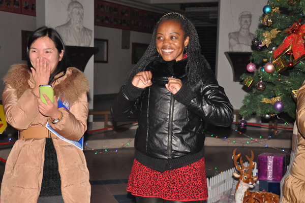 接着是猜字谜游戏。外教们与留学生密切配合,争分夺秒;外教比划动作,留学生猜出中文词语;外教手脚并用,留学生竞争激烈。笑声连连,其乐融融。游戏将晚会推向了第一个高潮。获得第一名的小组队员还获得了圣诞奖品。