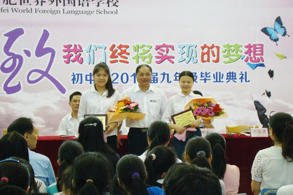 在本次典礼上,我校特意为两位志愿者进行了颁奖。在2015年高考考点承办过程中,我校有一位盲人考生。九(1)班的邢宇喆和李浩同学作为我校志愿者代表成功地为盲人考生做好了各项服务。两位同学的事迹不仅上了央视、人民网,而且两位同学在这次志愿者服务中获得了绝无仅有的体验。她们能有这样的机会,这不仅得益于我们世外学校的日益发展和社会知名度的扩大,更是得益于我校对学生全方位的培养。正所谓:世外根基,明理尚行。德智并重,学贯中西。在隆重的音乐声中,邵校长亲自为两位志愿者颁奖。美丽青春,志愿同行,两位同学的优秀表现,无愧于世外最美志愿者!伴随着音乐声,学生齐诵感恩宣誓词,行三鞠躬礼,很多同学情不自禁地给家长、老师、学校献上祝福,将整个现场推向了高潮。毕业典礼在全体九年级师生“志存高远,脚踏实地。慎思明辨,追求卓越”的豪迈口号中结束。