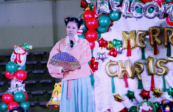 圣诞节当然少不了圣诞歌,初中国际班学生和外教带来的《We wish you a Merry Christmas》唱出了心中的真诚祝福;国际小学三年级学生们的校歌合唱《扬帆世外》,悠扬的旋律把孩子们心中对学校的热爱和感恩都化作了串串动人音符;高一英语1班全体学生和外教演绎《Born in the USA》,悠扬的旋律将美丽的记忆,顺着音乐的方向飘向远方;国际小学一年级的小天使们为大家带来圣诞颂歌《Christmas carols 》、国际小学五年级同学们带来的英文诗朗诵《A White Christmas》、国际小学二年级可爱的小朋友们的英文歌曲《Santa Claus is coming to town》,让外籍师生在世外感受到了圣诞的气氛;高一英语2班表演的歌舞小品《招新》令人赏心悦目,让人们在欢笑声中看清事实,明白一些真理;音乐是一种能触碰灵魂的东西,它是一种文化一种感觉,高一德语班全体师生带来的德语表演《Deutschland》,真切让我们感受到了音乐之美是跨语言、无国界的;高一英语国际班的古风新编《九九八十一》,以别样的风格唱出了千难万苦;国际小学部的孩子们再现《冰雪奇缘》,美丽善良的爱莎女王,勇敢乐观的安娜公主,让人感受真爱的力量,一切不安与不幸都“Let it go”;最后,留学生们化身“防弹少年团”表演了街舞《GO! GO!》,炫酷的步伐,动感十足的现代舞蹈,赢得了观众热烈的掌声。