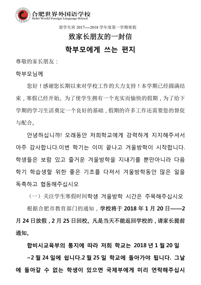 国际部寒假致家长的一封信