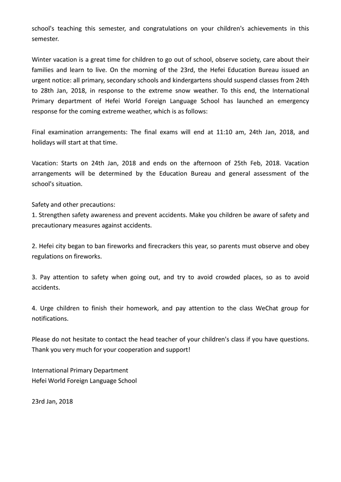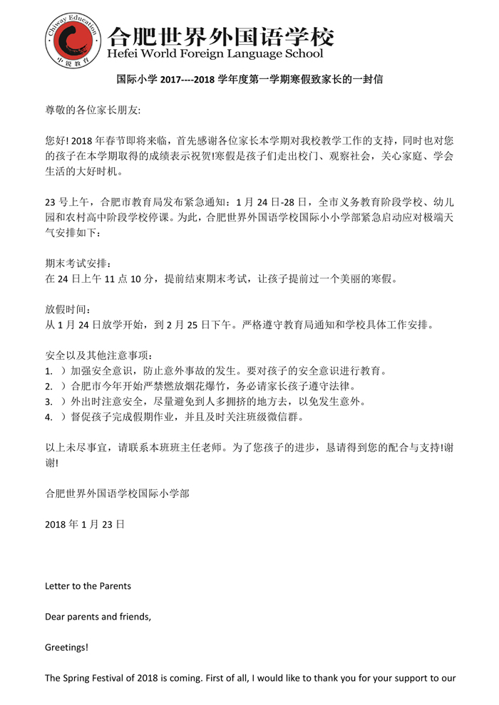 国际小学部寒假致家长的一封信